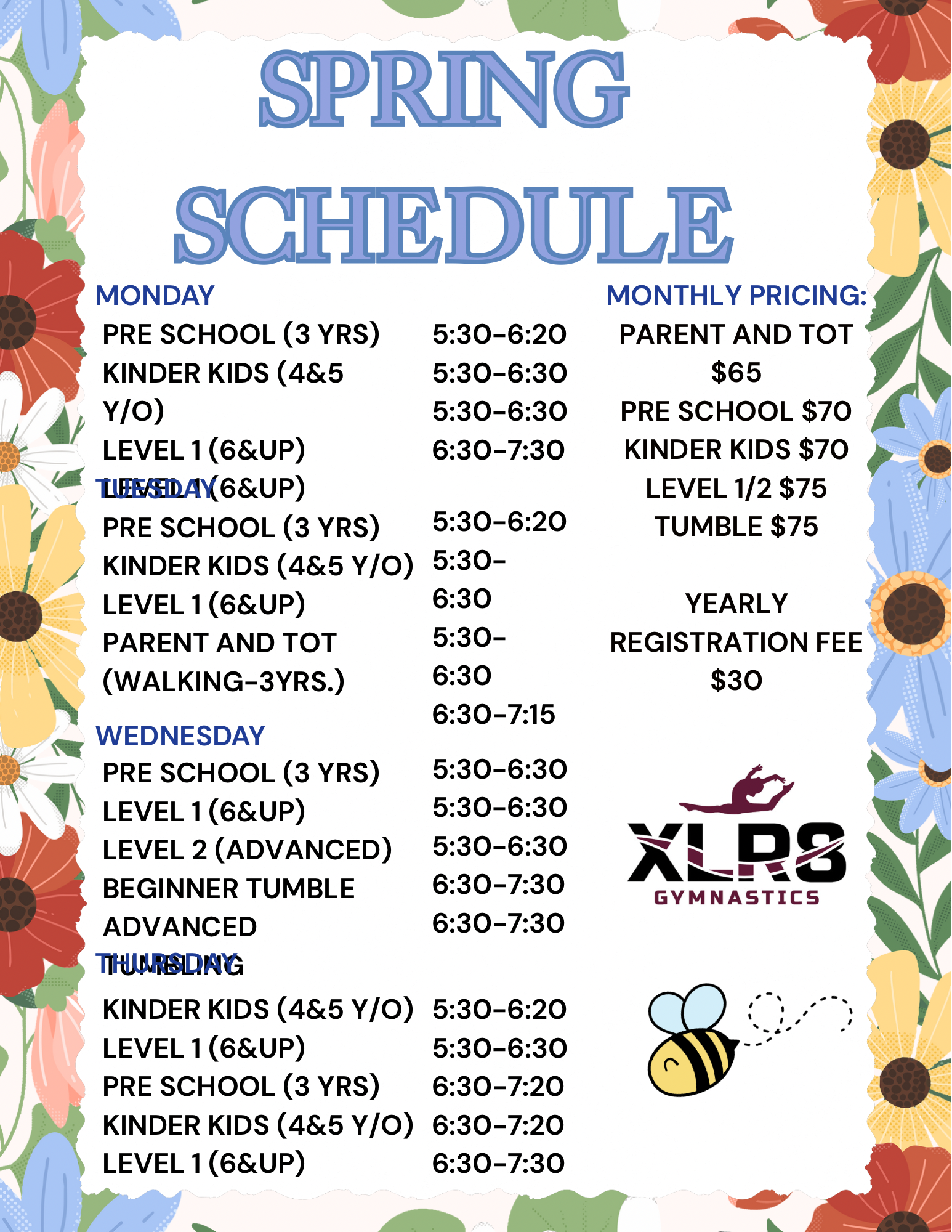 We also have a beginner gymnastics class for children ages 5-7. Students will learn beginner gymnastics skills on all four of the women's gymnastics events. This class is 50 minutes long.
